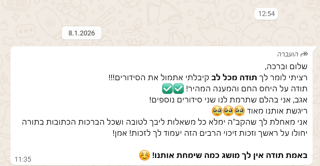מבצע 50% הנחה לרוכשים כל סידור אחר באתר