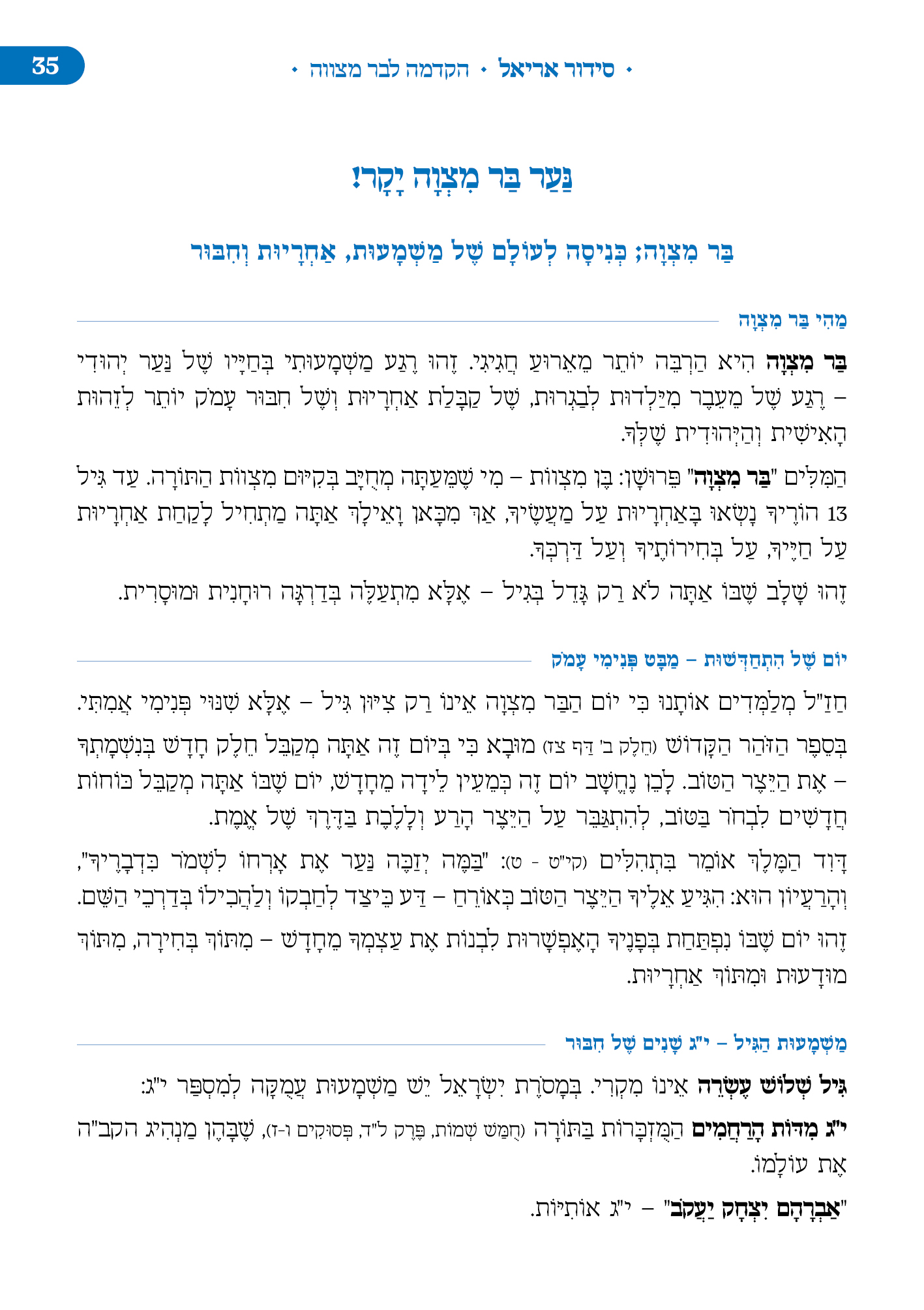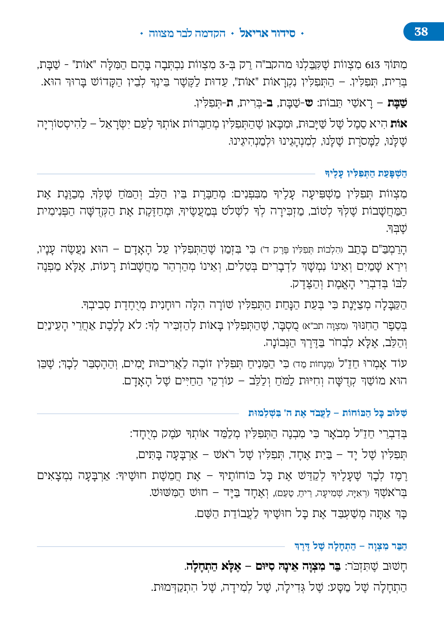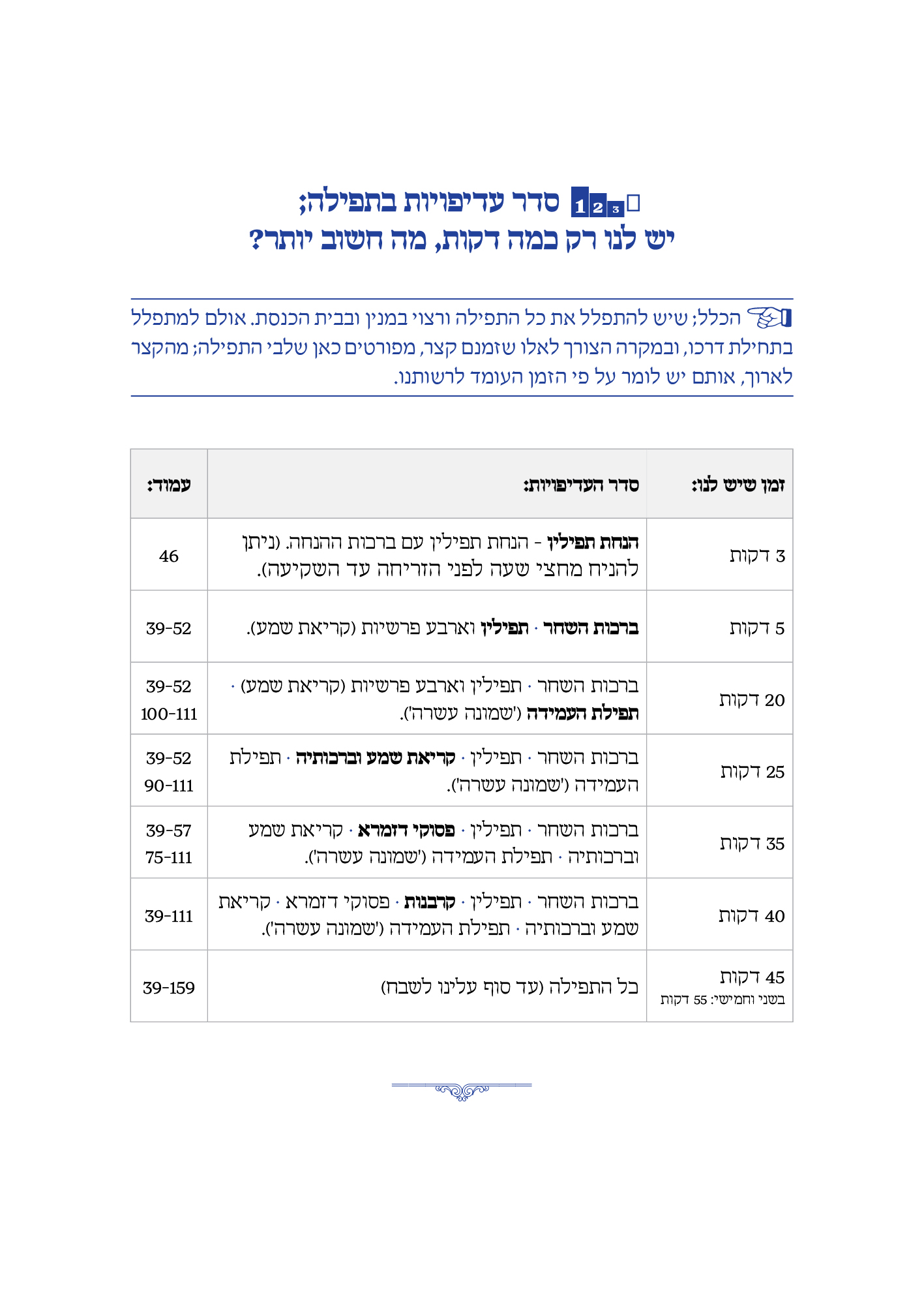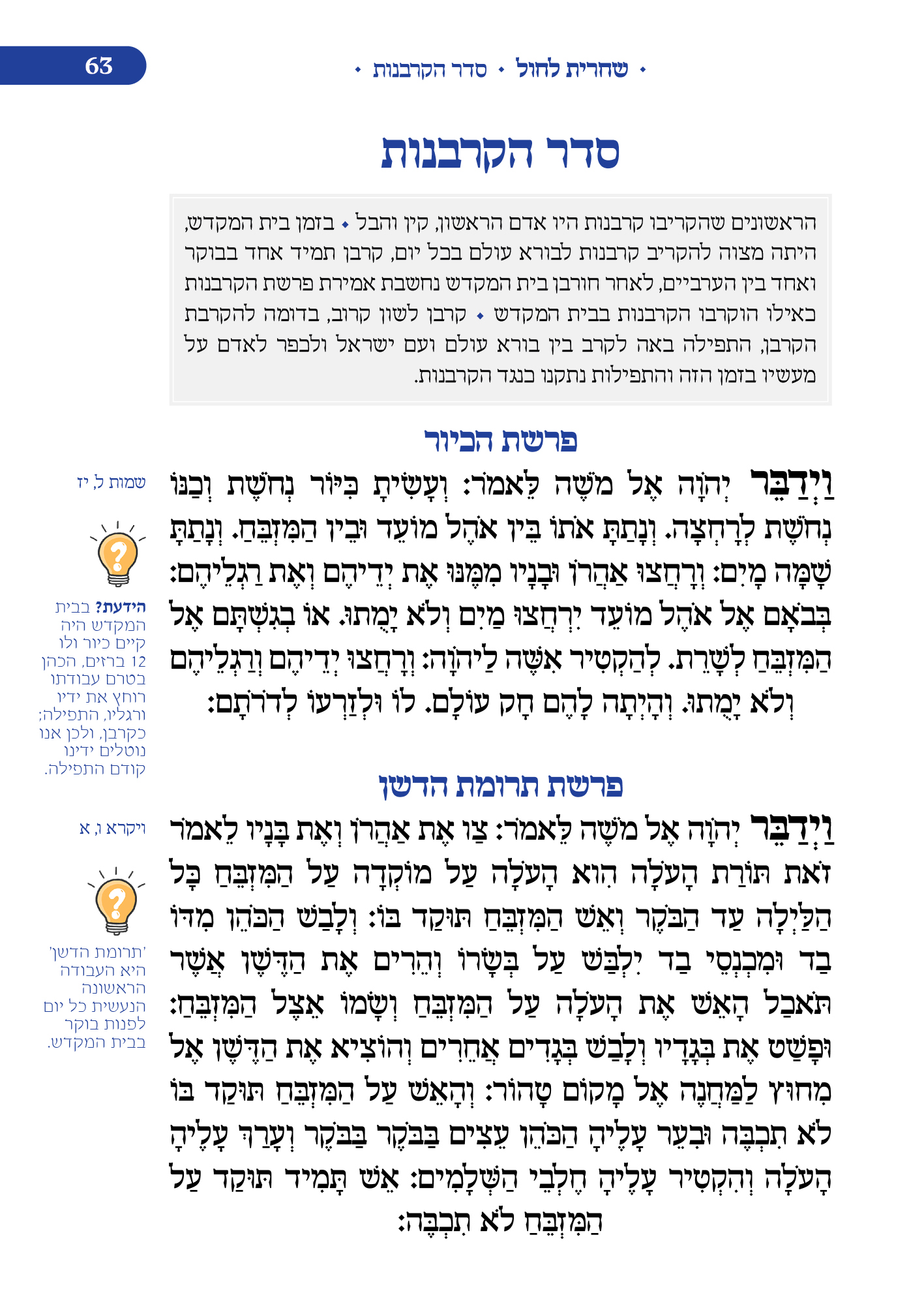 הסידור המובא כאן בנוי בצורה כרונולוגית החל מתפילת ימי החול: שחרית, מנחה וערבית ועד לימי סוף השבוע שישי - שבת בליווי הסברים מתאימים. הסידור בכריכה קשה בגודל של ספר קריאה 14X 21 המאגד בתוכו את כל נספחי התפילה המקובלים והמונהגים במועדי ישראל ומעגל החיים היהודי בליווי הסברים נהירים וברורים.