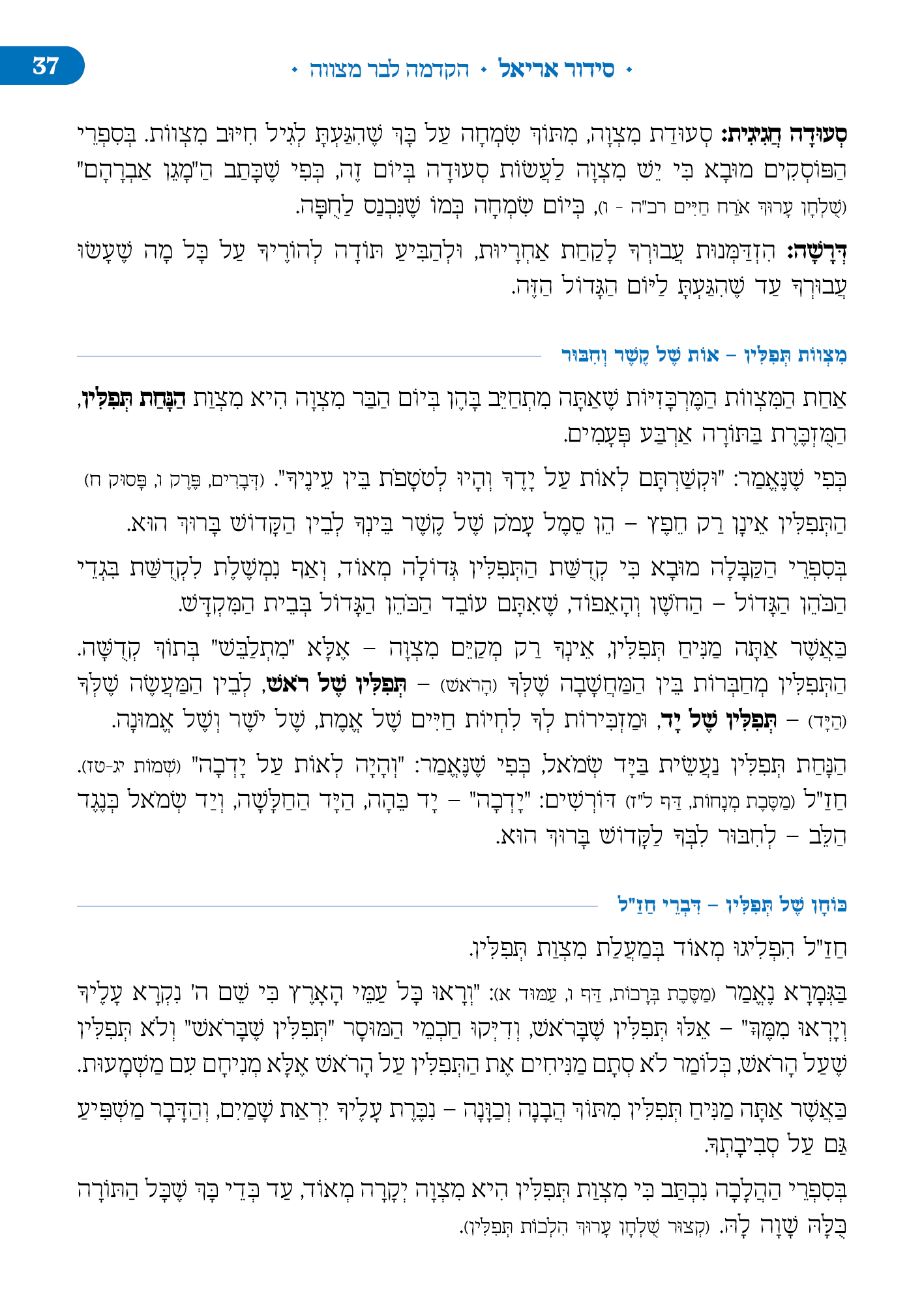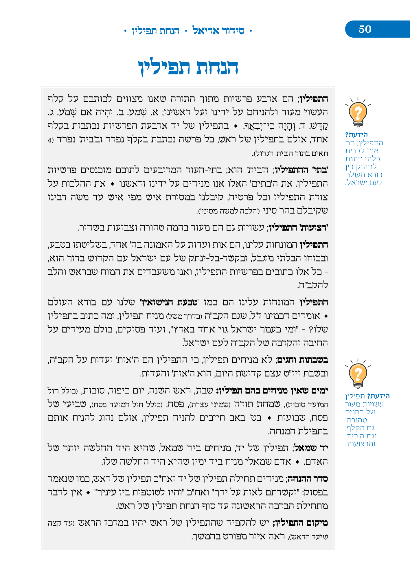 סידור אריאל הינו מדריך תפילה המיועד בעיקר למתפלל המתחיל, המסביר בשפה נגישה לכל אדם את רזי התפילה. לאורך הסידור ימצא המתפלל הסברים בליווי איורים צבעוניים, הוראות הפעלה, וקטעי הידעת אשר מדריכים כיצד יש להתפלל ולהתנהג בתפילה. בעקבות האירועים האחרונים והמלחמה שנכפתה על ישראל על ידי מרצחים בני עוולה החלטנו לצאת במהירות הבזק במהדורת כיס במיוחד לחיילי צה"ל וכוחות הביטחון,בה ריכזנו והוספנו את התפילות הרלוונטיות ביותר למתפלל בעת זו.